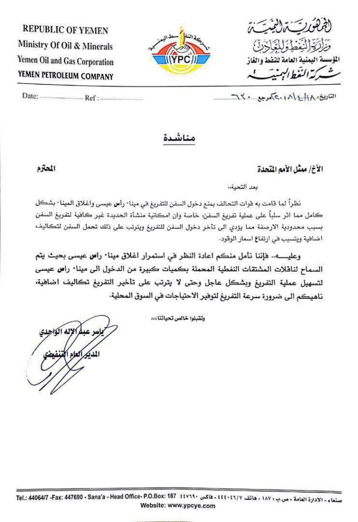 الى ذلك طالب المدير التنفيذي لشركة النفط في مذكرة صادرة عن الشركة ، الممثل المقيم للإمم المتحدة بفتح منشأة رأس عيسى إمام السفن لتفريغ المشتقات النفطية لتغطية حاجات المواطنيين