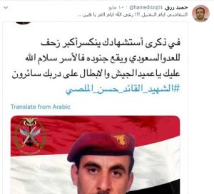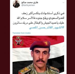 نشر الاعلامي بقناة المسيرة حميد رزق على حسابة في تويتر صورة لمنشور سابق لطارق محمد صالح عفاش توضح حقيقة في الامس عندما ادعى انه ضد العدوان السعودي وكيف استخدم الشهيد الملصي لتمرير مشروعة الذي ظهر في 2 ديسمبر