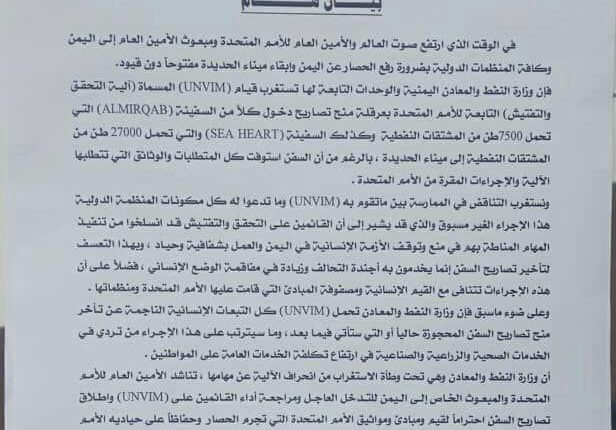 وأكدت وزارة النفط أن (UNVIM) المسماه (الية التحقق والتفتيش ) التابعة للأمم المتحدة تعرقل منح تصاريح دخول كلاً من السفينة (ALMIRQAB) التي تحمل 7500 طن من المشتقات النفطية وكذلك السفينة ( SEA HEART) والتي تحمل 27000 طن من المشتقات النفطية إلى ميناء الحديدة.