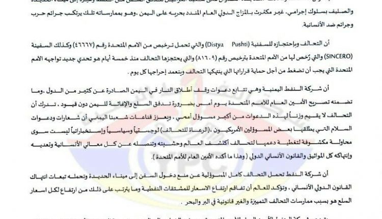 ولفت البيان إلى احتجاز تحالف العدوان للسفينة (Distya Pushti) والتي لديها ترخيص من الأمم المتحدة رقم (٤٦٦٦٧) وكذا السفينة (SINCERO) والتي رٌخص لها من الأمم المتحدة بترخيص رقم (٨١٦٠٩) منذ خمسة أيام.. معتبرا ذلك تحدي جديد للأمم المتحدة التي يجب أن تضغط من آجل حماية قراراتها التي ينتهكها التحالف ويتعمد إحراجها كل يوم.