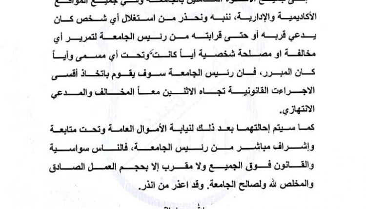 “الى جميع الاخوة العاملين بالجامعة وفي جميع المواقع الأكاديمية والإدارية، ننبه كم استغلال أي شخص كان يدعي قربه أو حتى قرابته من رئيس الجامعة لتمرير أي مخالفة أو مصلحة شخصية أيا كانت وتحت أي مسمى وأياً كان المبرر، فإن رئيس الجامعة سوف يقوم باتخاذ أقسى الإجراءات القانونية تجاه الاثنين معاً المخالف والمدعي.