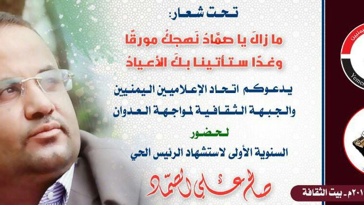 يدعوكم اتحاد الاعلاميين اليمنيين والجبهة الثقافية لمواجهة العدوان ، لحضور فعالية إحياء الذكرى السنوية الأولى للرئيس الشهيد صالح علي الصماد