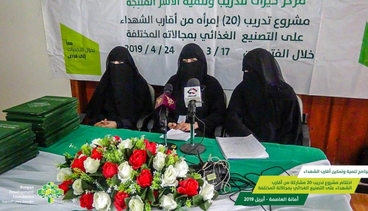 وهدف المشروع التدريبي خلال الفترة من 17 مارس – 24 أبريل 2019م، إلى اكساب 20 مشاركة من أقارب الشهداء عدد من المهارات والخبرات حول كيفية تصنيع و إنتاج العصائر ، الصلصة ، الشطة ، المعجنات، والمربيات والمخللات.