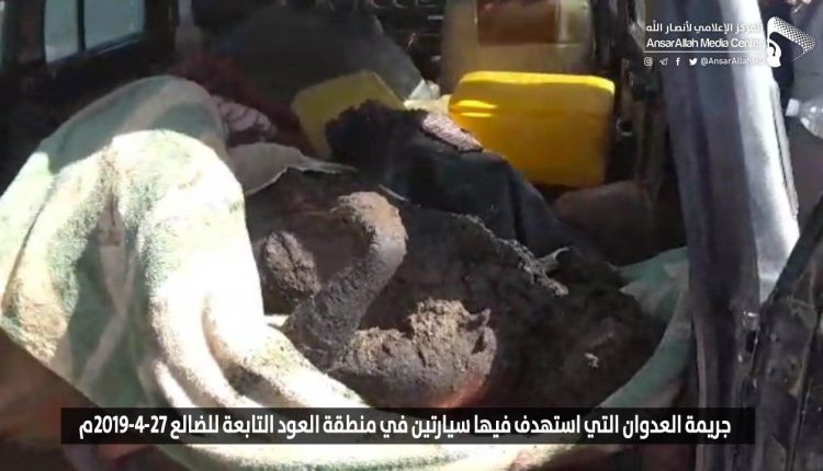 الصمود | أدانت وزارة حقوق الإنسان جريمة استهداف طيران العدوان لسيارتين على متنهما مسافرين بمنطقة العود محافظة الضالع ما أدى إلى استشهاد سبعة مواطنين بينهم نساء وأطفال معظمهم تفحمت أشلاؤهم .