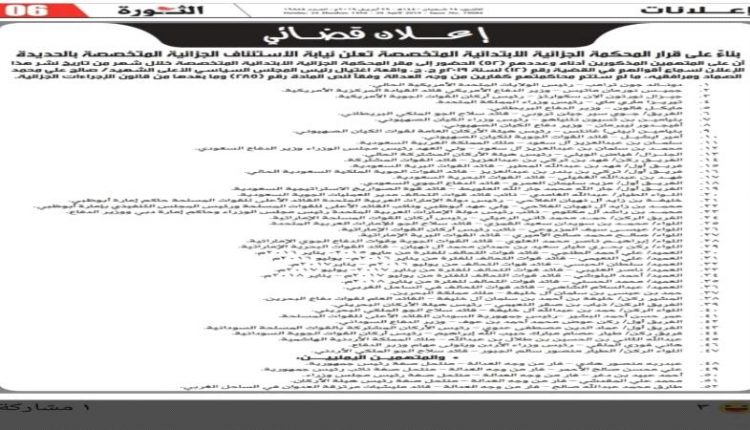 ونشرت صحيفة الثورة الرسمية في عددها الصادر اليوم إعلان قضائي تضمن دعوة المتهمين في قضية اغتيال الرئيس الشهيد صالح علي الصماد للمثول أمام المحكمة الجزائية المتخصصة.