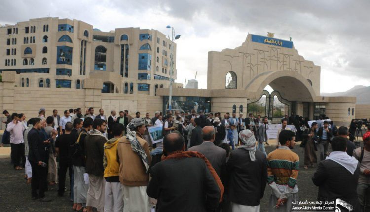 نظم اعلاميون وحقوقيون وقفة تضامنية مع وزارة الإعلام ورئيس اتحاد الإعلاميين اليمنيين عبدالله علي صبري ضد ما تعرضوا له من استهداف مباشر من قبل طائرات تحالف العدوان السعودي الامريكي بعدة غارات منها غارة جوية على منزل رئيس الاتحاد الكاين بحي الرقاص بأمانة العاصمة صباح الخميس 16 مايو الجاري ذهب ضحيتها أكثر من 60 شخصا بين شهيد وجريح منهم إثنان من أولاد صبري “لؤي وحسن”.