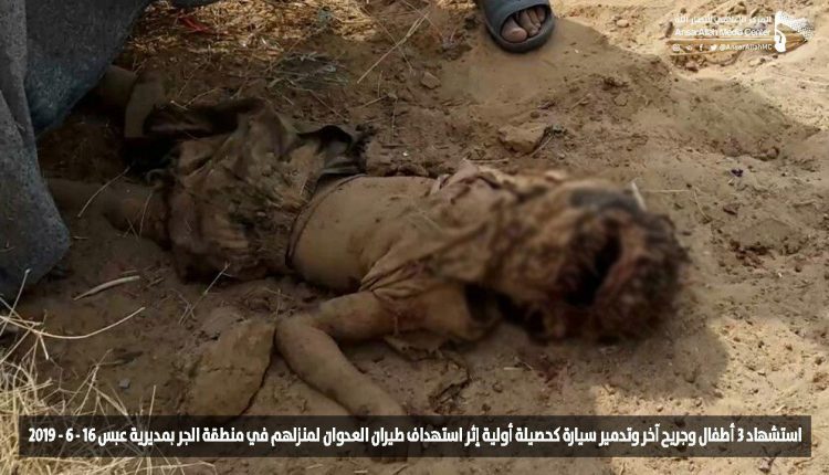 وأفاد مصدر محلي بالمحافظة بأن طيران العدوان استهدف منزلا في منطقة الجر بمديرية عبس محافظة حجة ما أدى إلى استشهاد 3 أطفال وإصابة امرأة بجروح خطيرة, وتدمير سيارة.