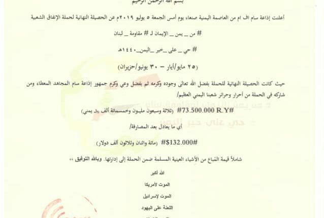 أعلنت إذاعة سام اف ام من العاصمة اليمنية صنعاء يوم أمس الجمعة 5 يوليو 2019م عن الحصيلة النهائية لحملة الإنفاق الشعبية