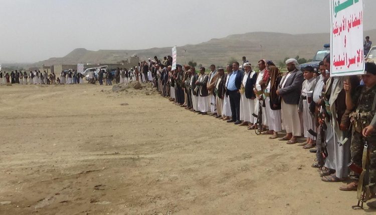 وقفة قبلية مسلحة لأبناء مديرية عمران تنديداً بجرائم العدوان