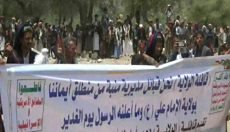 وخلال الفعالية قدم أبناء ومشائخ المديرية قافلة غذائية بأسم (الولاية ) دعما واسنادا للمرابطين في الجبهات من الجيش واللجان الشعبية ، مؤكدين ان هذه القافلة هي منطلق إيمانهم بولاية الإمام علي وما اعلنة الرسول يوم الغدير وهي اقل مايمكن تقديمة لمن يضحون باانفسهم في سبيل الدفاع عن الارض والعرض .