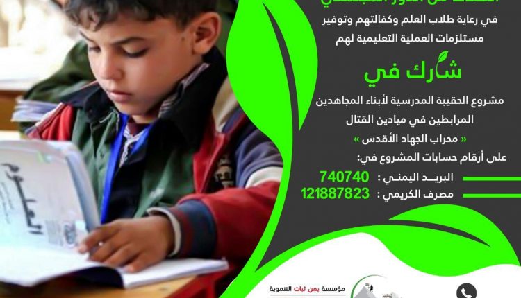 دعت مؤسسة “يمن ثبات التنموية”، جميع أبناء الشعب اليمني، للمشاركة في حملة “الحقيبة والزي المدرسي”، لأبناء المرابطين من أبطال الجيش واللجان الشعبية، في ميادين الدفاع عن الأرض والعرض.