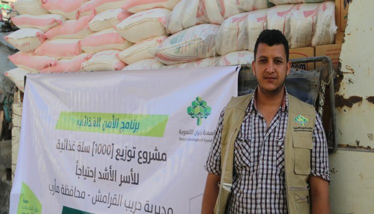 مؤسسة بنيان توزع 1000سلة غذائية بمديرية حريب القراميش بمحافظة مأرب
