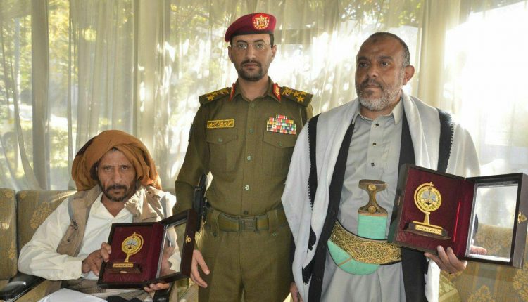 كرم مدير دائرة التوجيه المعنوي – المتحدث الرسمي باسم القوات المسلحة العميد يحيى سريع اليوم بصنعاء الأسيرين المحررين من منتسبي دائرة التوجيه المعنوي الأسير الجريح علي الكاظمي والأسير إسماعيل لقمان بدرع دائرة التوجيه المعنوي تقديراً لهما واعتزازاً بمواقفهما البطولية الشجاعة.