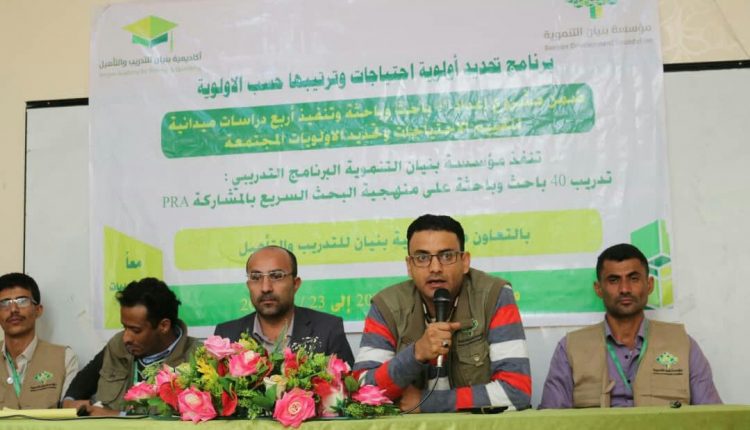 بدأت بصنعاء اليوم دورة تدريبية حول منهجية البحث السريع بالمشاركة PRA” ” لتحديد أولويات الاحتياجات المجتمعية تنظمها مؤسسة بنيان التنموية بالتعاون مع أكاديمية بنيان للتدريب و التأهيل .