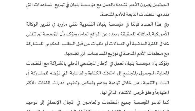 نفت مؤسسة بنيان التنموية ما نشرته وكالة أسوشيتد برس الامريكية في تقرير لها بتاريخ 19 فبراير شباط الجاري بأن ما أسمتهم الحوثيين يجبرون الأمم المتحدة بالعمل مع مؤسسة بنيان في توزيع المساعدات التي تقدمها المنظمات التابعة للأمم المتحدة .