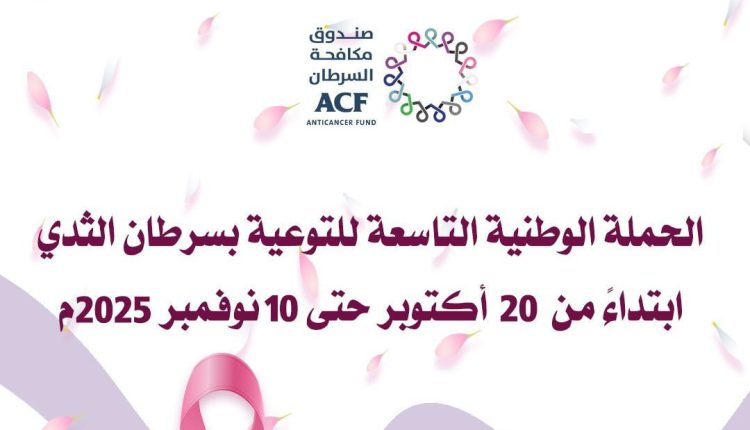 دشّن صندوق مكافحة السرطان الحملة اليوم الوطنية التاسعة للتوعية بسرطان الثدي، والتي تستمر خلال الفترة من ٢٠ أكتوبر وحتى 10 نوفمبر 2025م، تحت شعار يهدف إلى تعزيز الوعي المجتمعي بأهمية الكشف المبكر ودوره المحوري في رفع معدلات الشفاء.